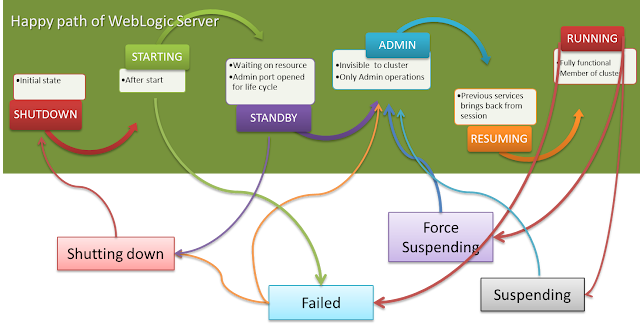 Using above shown MBean hierarchy we can fetch the all WebLogic domain server instance's states. If your production WebLogic domain consists of two digit (eg. 60 instances) or three digit number (eg. 120 instances) of managed server then, it is difficult to see all server’s state at once. Weblogic Administration console is unable to show all the servers in the domain on a single page. Navigating in between also a time eating process so think! think better way!! WLST has the solution.