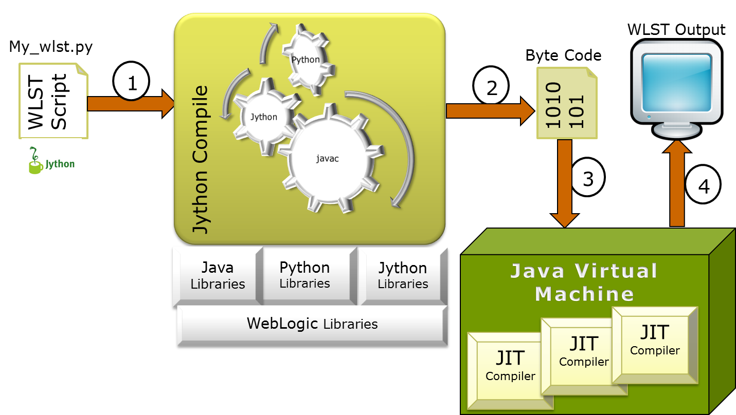 The source code for the WLST script is written in Python code. The WLST program file must have the extension as .py which is the source code consisting a set of Jython instructions for WebLogic domain. This source code is going to use a JVM machine when it is instructed to RUN the script; its invocation internally generates Java byte code to interpret with the JVM to produce the desired output.