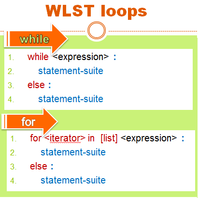 We can see the major types of WLST iterations control flows available such as 'for loop' and 'while loop'.The range function